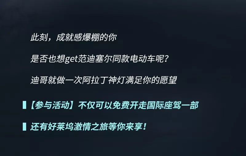 现在去@雅迪电动车官方微博 与微信公众号雅迪电动车上,响应范·迪塞尔的紧急召唤,即可参与“制造”范迪塞尔专属座驾——雅迪G5,为范迪塞尔制作一辆雅迪G5助他完成任务,既有机会免费获得一辆同款座驾,感受与范迪塞尔并驾狂飙的激情与快感。除了免费的国际座驾,H5中还有好莱坞激情之旅及范迪塞尔系列周边等多重大礼相赠,范迪塞尔粉丝千万不可错过!